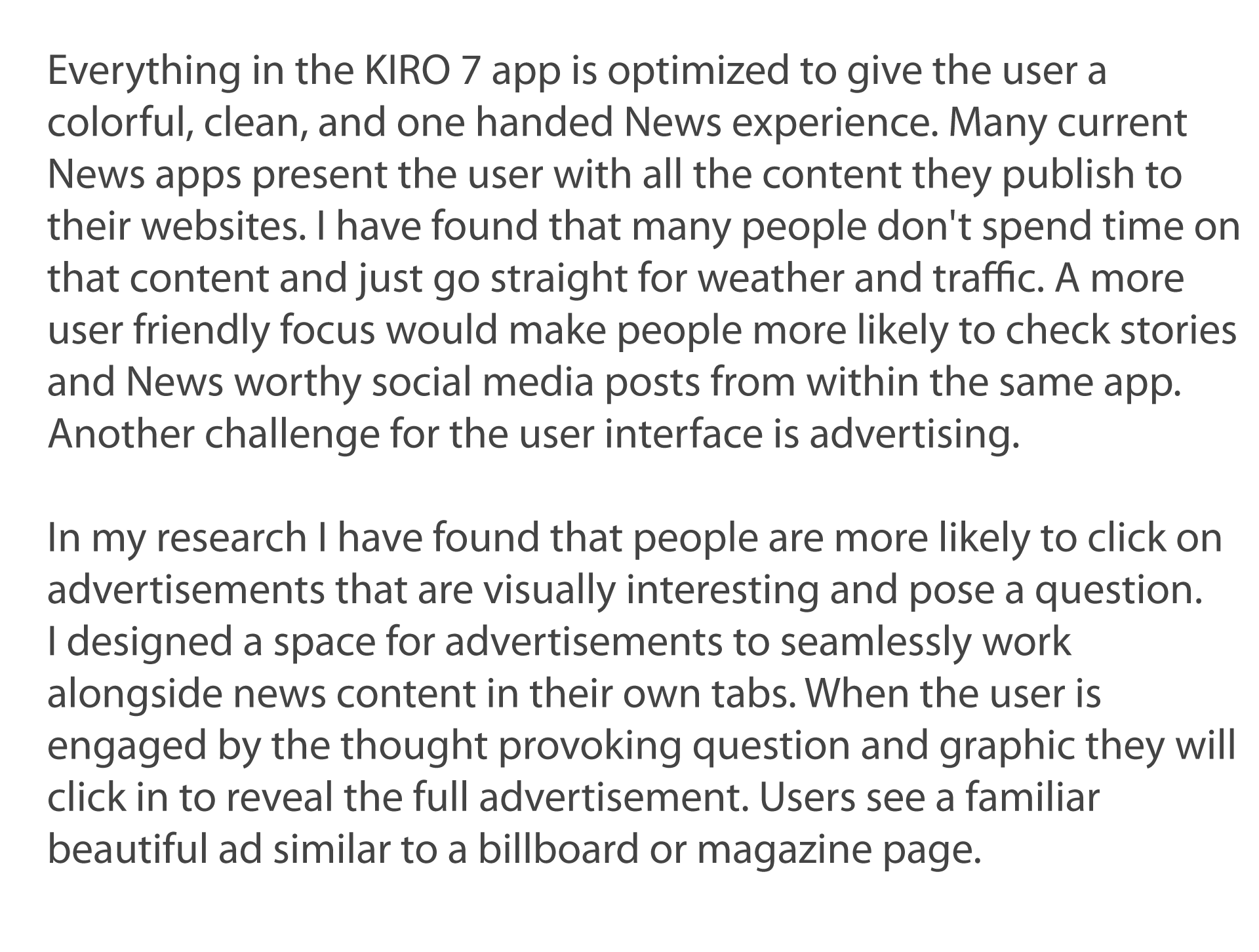 This application was my experiment with trying to create a better user experience for people using News apps. Personally, I don't like many of the News apps out there because they flood you with too much content, and it's hard to access with one finger. Some get it right in one or two sections, and then they drop the ball. I'd love to see Cox Media take a hard look at this interface and offer a top notch product to the many markets they cover. Traditional TV News viewers have moved on to mobile, and someone really should meet their needs.